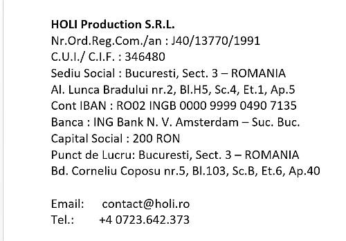 HOLI Production SRL incearca, pe cat posibil, sa va ofere in acest site informatie cat mai noua, dar nu ofera garantii in ceea ce priveste exactitatea acesteia. HOLI Production SRL nu isi asuma nicio responsabilitate pentru orice eroare sau omisiune din continutul acestui site.